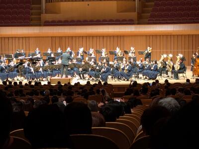 明倫中学校の出番は21番目。演目は『カントゥス・ソナーレ』。57名の部員が心を合わせ、迫力のある演奏で、ホールの観客を魅了しました。