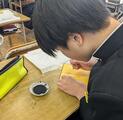 現在、2年生の美術では、日本画による金屏風づくりに挑戦しています。日本画には骨描き、隈取り、色つけなどの過程がありますが、まずは細い線を筆で描く“骨描き”です。練習として1㎜幅の連続した直線や曲線を描いてみますが、なかなか難易度が高く、「手が震える」「直線ムズ」「カーブで太くなってしまう」といった声が聞こえました。ALTのメーガン先生も生徒に交じって筆書きに悪戦苦闘。そのうちコツをつかんで屏風に骨描きを始める生徒も。屏風は来月完成の予定です。